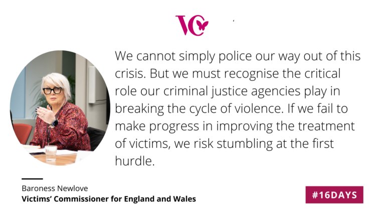 This blog marks the beginning of 16 Days of Activism. In the coming weeks, the Victims’ Commissioner will be sharing a series of blogs, examining the role of the criminal justice system in tackling violence against women and girls.