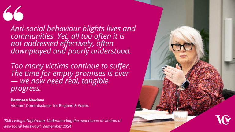 Five years after her landmark report on anti-social behaviour, the Victims’ Commissioner has issued a renewed plea for action, including a series of victim-focused recommendations: