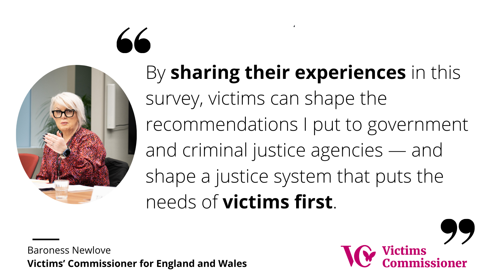 As part of this research project, the Victims’ Commissioner wants to hear from victims across England and Wales. The survey is anonymous and open to victims whose crime resulted in charge by the CPS, regardless of when the crime took place or whether the case is still ongoing.